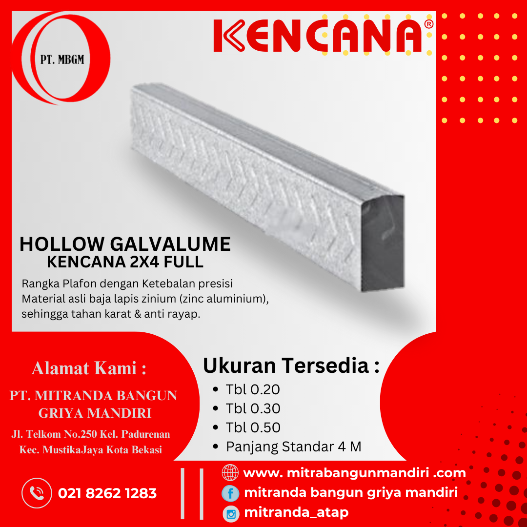 Hollow gipsum Ukuran 2×4 dan 4X4 dengan Varian Ketebalan Mulai dari 0,25 mm – 0,6 mm biasanya terbuat dari besi galvanis dan galvalum.