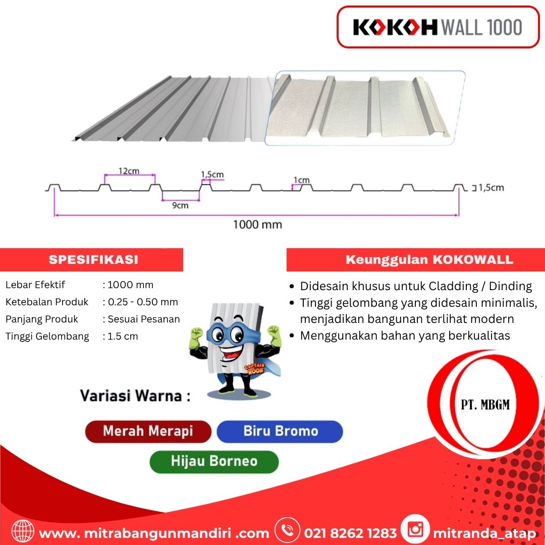 Atap spandek kokohspan warna yang memiliki lebar efektif 1000 mm. Variasi warna – Merah merapi – Biru Bromo – Hijau Borneo
