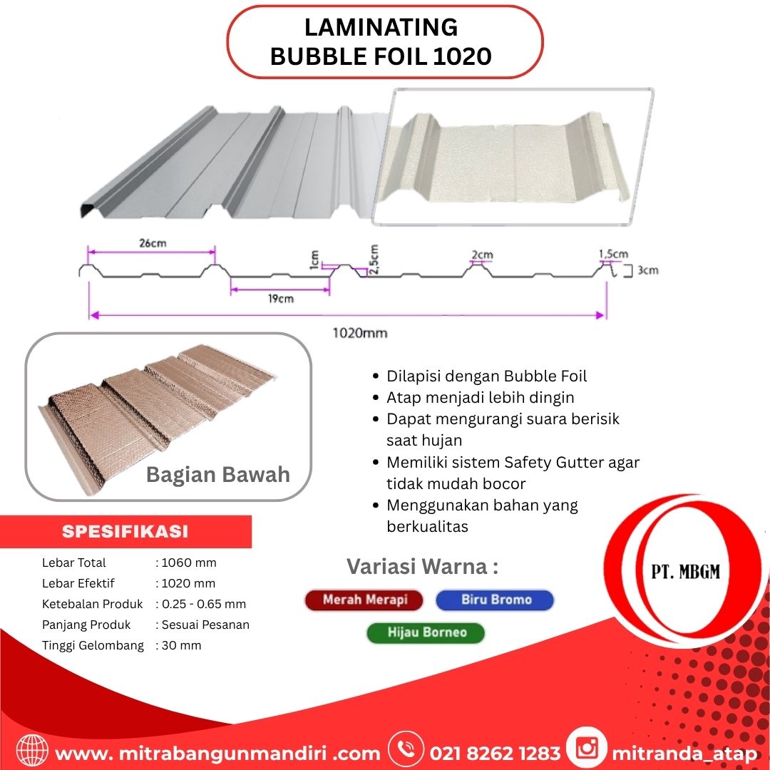Atap Spandek Laminasi Foil adalah spandek dengan lebar efektif 1020 mm yang dilapisi foil bubble 4 mm
